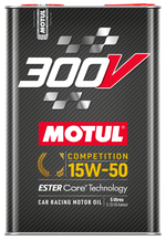 100% Synthetic racing motor oil. Based on technology and above all existing motorsport standards. The 300V Motorsport COMPETITION 15W-50 was specially designed to be used for endurance racing, rally, as well as GT racing or historic racing cars with rebuilt engines. Through technical partnerships with most prestigious racing teams, MOTUL has developed a wide range of lubricants for Racing and Sport cars. By selecting esters over other high performance synthetic base stocks and combining them with an innovative additive package, MOTUL has created a perfect synergy. This most advanced Ester Technology allows maximum power output of the engine without compromising reliability and wear. The 300V Motorsport COMPETITION 15W-50 reduces wear thanks to its maximum oil film resistance at high temperature. This product is also formulated with friction modifier for maximum output and decrease operating temperature. Finally oil consumption is reduced and oil pressure remains stable during severe conditions. This engine oil is made for race prepared engines operating over a wide range of rpm and temperatures, please consult your tuning partner for the appropriate drain interval.