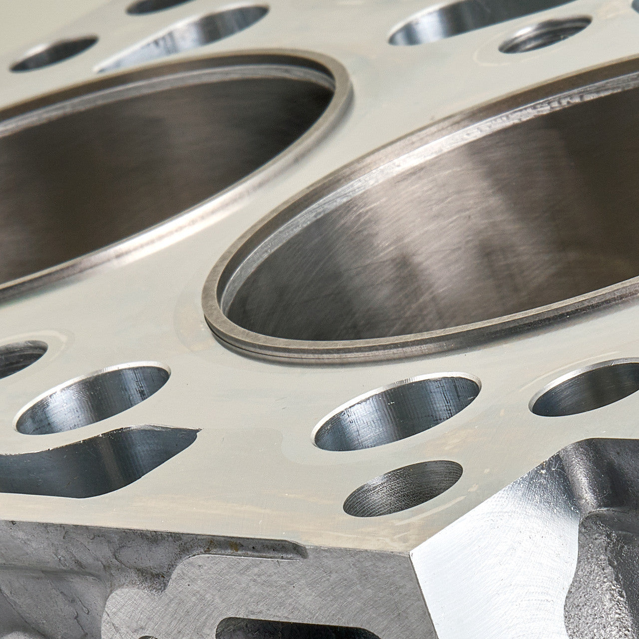 Our unique closed deck system significantly increases the strength of the OEM case halves. This process supports the cylinder walls at the top of the case in order to prevent flexing and possible cracking where the case bolt reliefs are cut into the back of the cylinder wall. During the installation process we machine the assembled case halves in our Haas VF-4SS CNC mill to accept the IAG Closed Deck inserts. Once the case has been machined we heat it in an oven while freezing the specially machined inserts with liquid nitrogen. The inserts are then pressed into place and then machined to a mirror finish. The unique inserts feature small passages that allow needed coolant flow to the deck surface. This means that the closed deck system does not affect the block's cooling ability and will not cause overheating, even in daily drivers.
