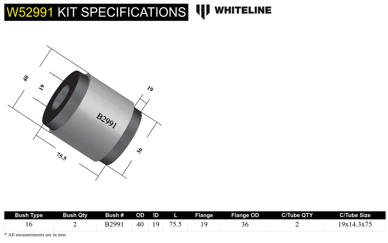 Worn front control arm bushings have a huge influence on vehicle stability, steering precision and braking efficiency. Replace worn bushings to as new condition utilising Whiteline's advanced synthetic elastomer bushings with core characteristics ensuring superior elasticity, memory and outright durability for all forms of driving applications.