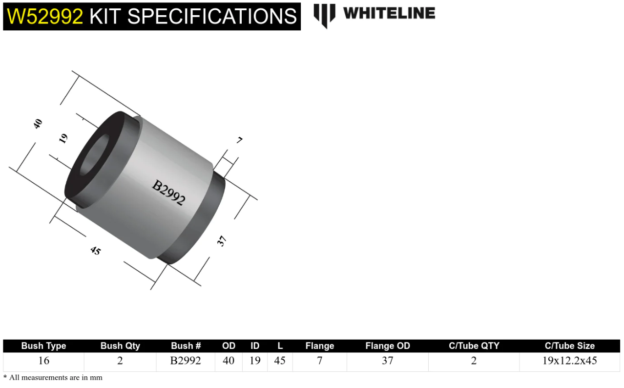 Worn front control arm bushings have a huge influence on vehicle stability, steering precision and braking efficiency. Replace worn bushings to as new condition utilising Whiteline's advanced synthetic elastomer bushings with core characteristics ensuring superior elasticity, memory and outright durability for all forms of driving applications.