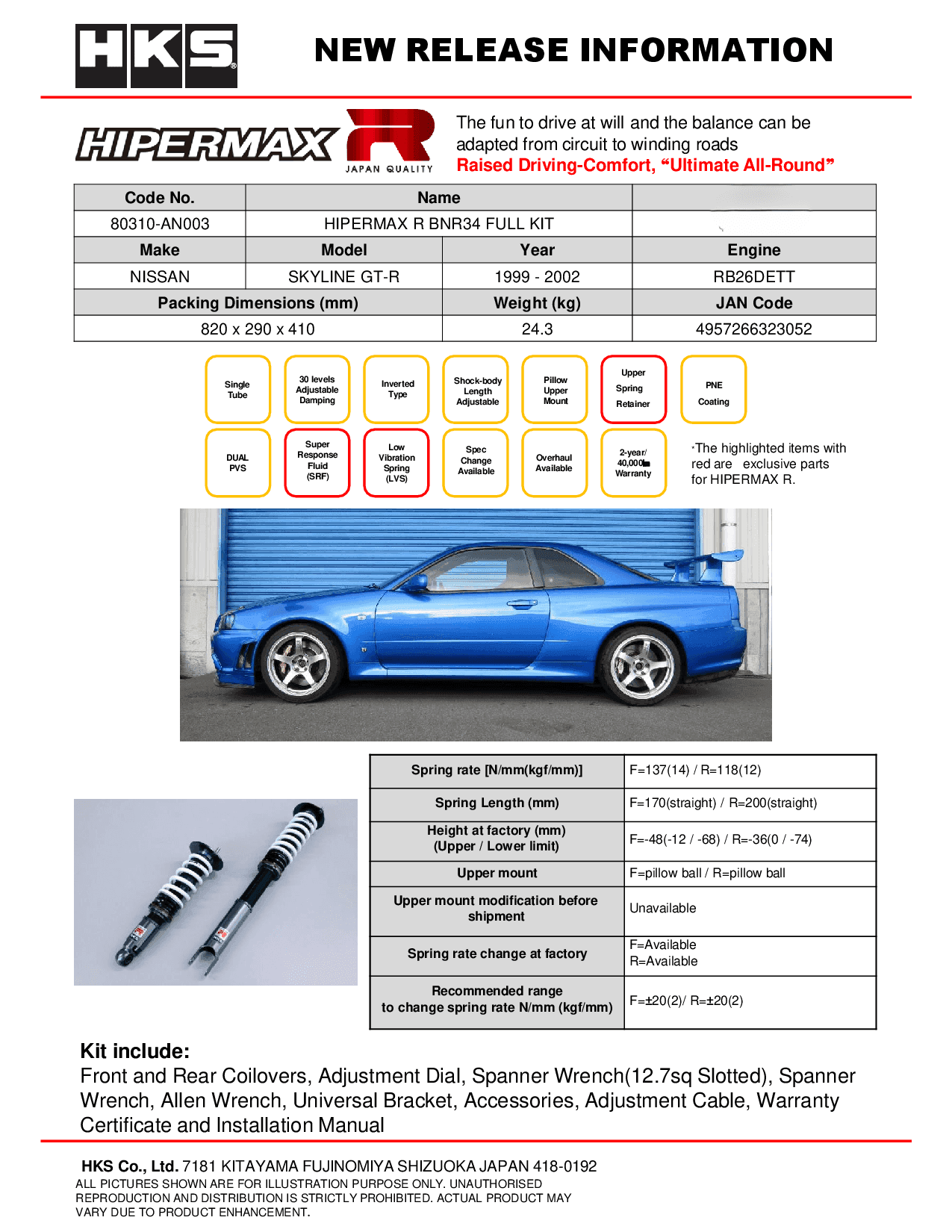 HKS Hipermax R Coilover Kit 1999-2002 Nissan Skyline GT-R (BNR34)