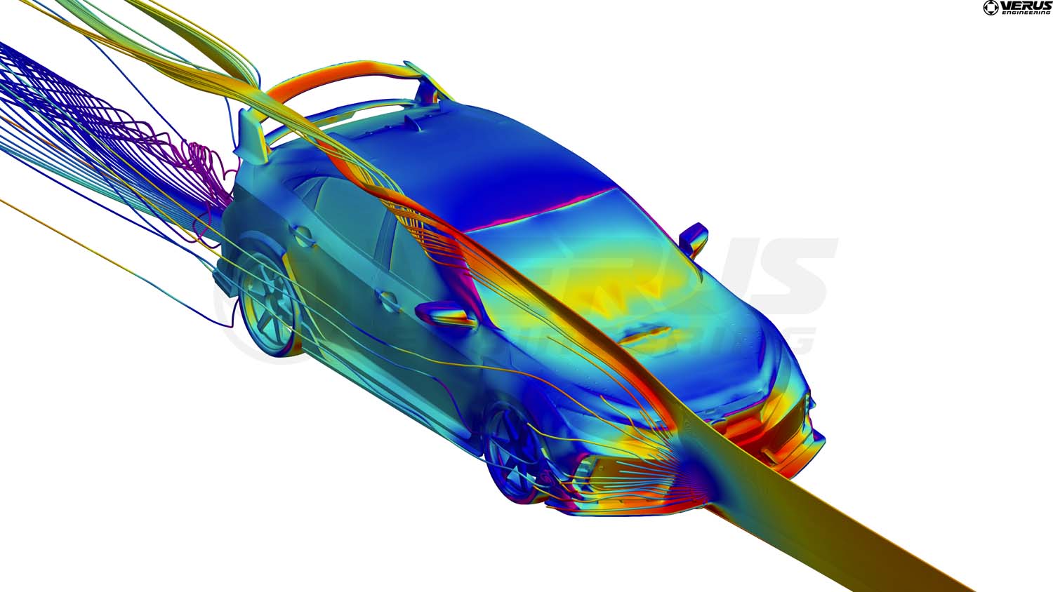 Front splitters are very effective at producing efficient front end downforce. They do so by creating a large delta between the top and bottom surfaces. Utilizing state-of-the-art analysis software during the R&D process, we were able to ensure the front splitter improved performance as designed and balanced out our rear wing kit as well.