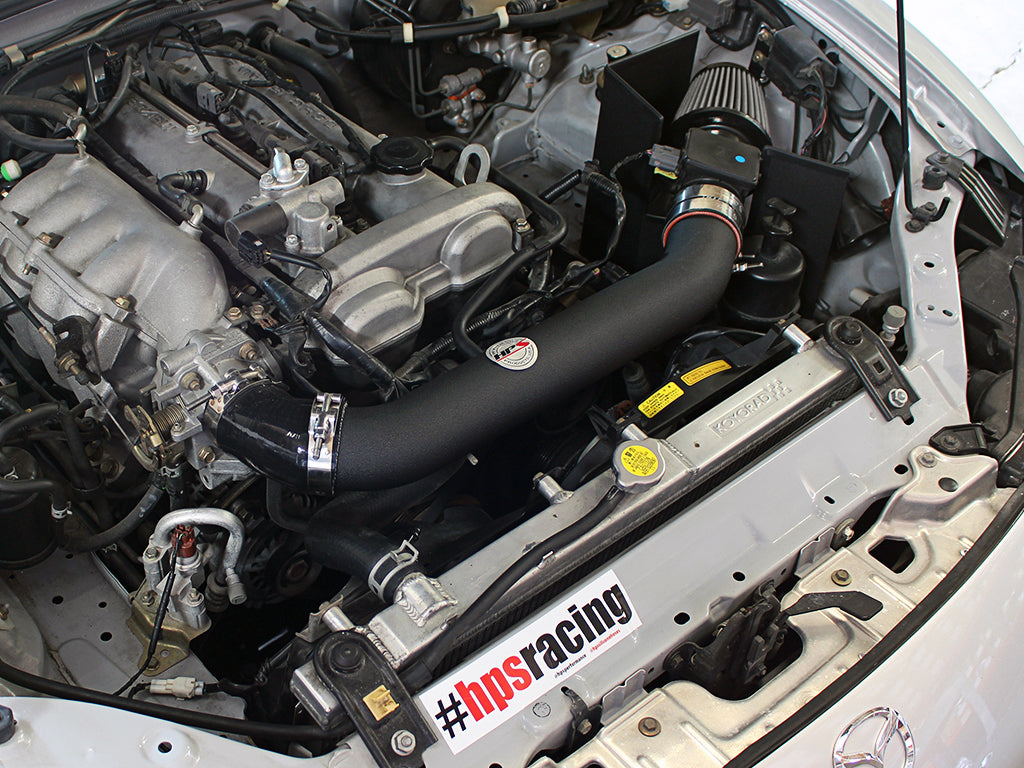 The All-New HPS Performance 827 Series Air Intake Kit (Black, Part # 827-537WB) for 1999-2005 Mazda Miata 1.8L Non Turbo offers a free-flowing 2-3/4 inch mandrel-bent aluminum tube induction system designed to increase horsepower, torque and improve throttle response while maintaining safe air fuel ratio. The heavy duty powder coated steel heat shield blocks hot air from the air filter for the best cooling effect. The included installation manual has clear pictures and instructions to guide the installer throughout the whole process. The kit does NOT require tuning and does not trigger CEL light. No modification is required during the installation. HPS light weight mandrel-bent aluminum alloy tube replaces the stock restrictive air box and optimize the air flow with excellent heat dissipation and long lasting durability. HPS Performance 827 Series air intake kit features race proven reinforced silicone hoses and industrial grade 100% stainless steel T-bolt clamps which ensures reliability, even during the most extreme driving conditions. The All-New HPS Performance Air Filter is designed with performance in mind, delivering excellent filtration without sacrificing air flow. All HPS Performance Air Filter are made in the United States.