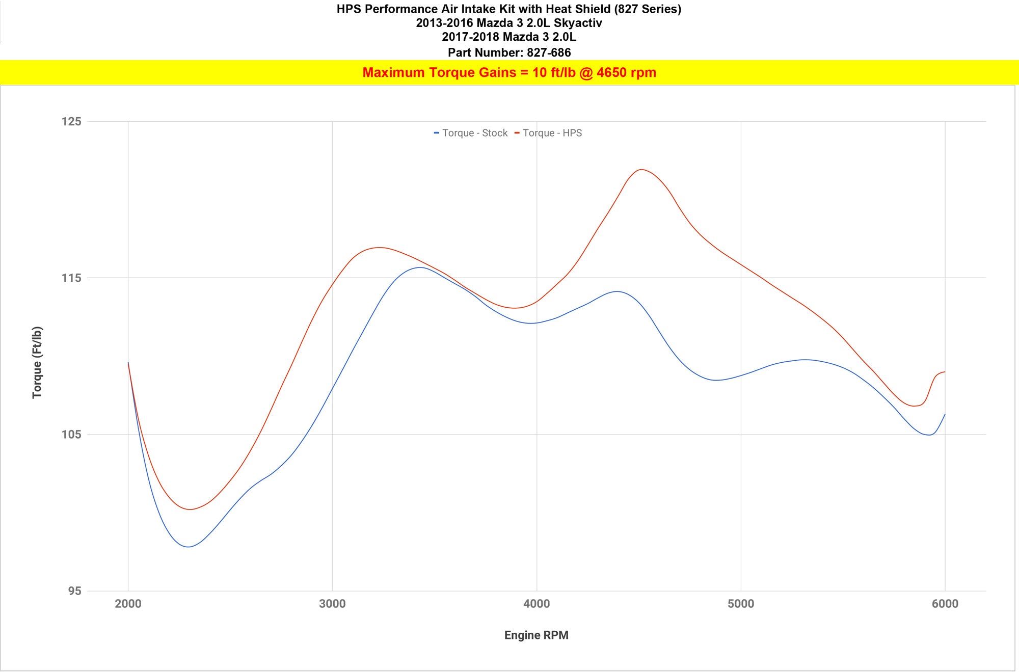 The All-New HPS Performance 827 Series Air Intake Kit (Black, Part # 827-686WB) for 2013-2018 Mazda Mazda3 2.0L Skyactiv offers a free-flowing 3 inch mandrel-bent aluminum tube induction system designed to produce dyno proven performance gains +10 Whp horsepower, +10 Ft/lbs torque and improve throttle response while maintaining safe air fuel ratio. The heavy duty powder coated steel heat shield integrates with the factory fresh air scoop to direct cold air to the air filters for the best cooling effect. The included installation manual has clear pictures and instructions to guide the installer throughout the whole process. The kit does NOT require tuning and does not trigger CEL light. No modification is required during the installation. HPS light weight mandrel-bent aluminum alloy tubes replace the stock restrictive air box and optimize the air flow with long lasting durability. HPS Performance 827 Series air intake kit features race proven reinforced silicone hoses and industrial grade 100% stainless steel T-bolt clamps which ensures reliability, even during the most extreme driving conditions. The All-New HPS Performance Air Filter is designed with performance in mind, delivering excellent filtration without sacrificing air flow. All HPS Performance Air Filters are made in the United States.