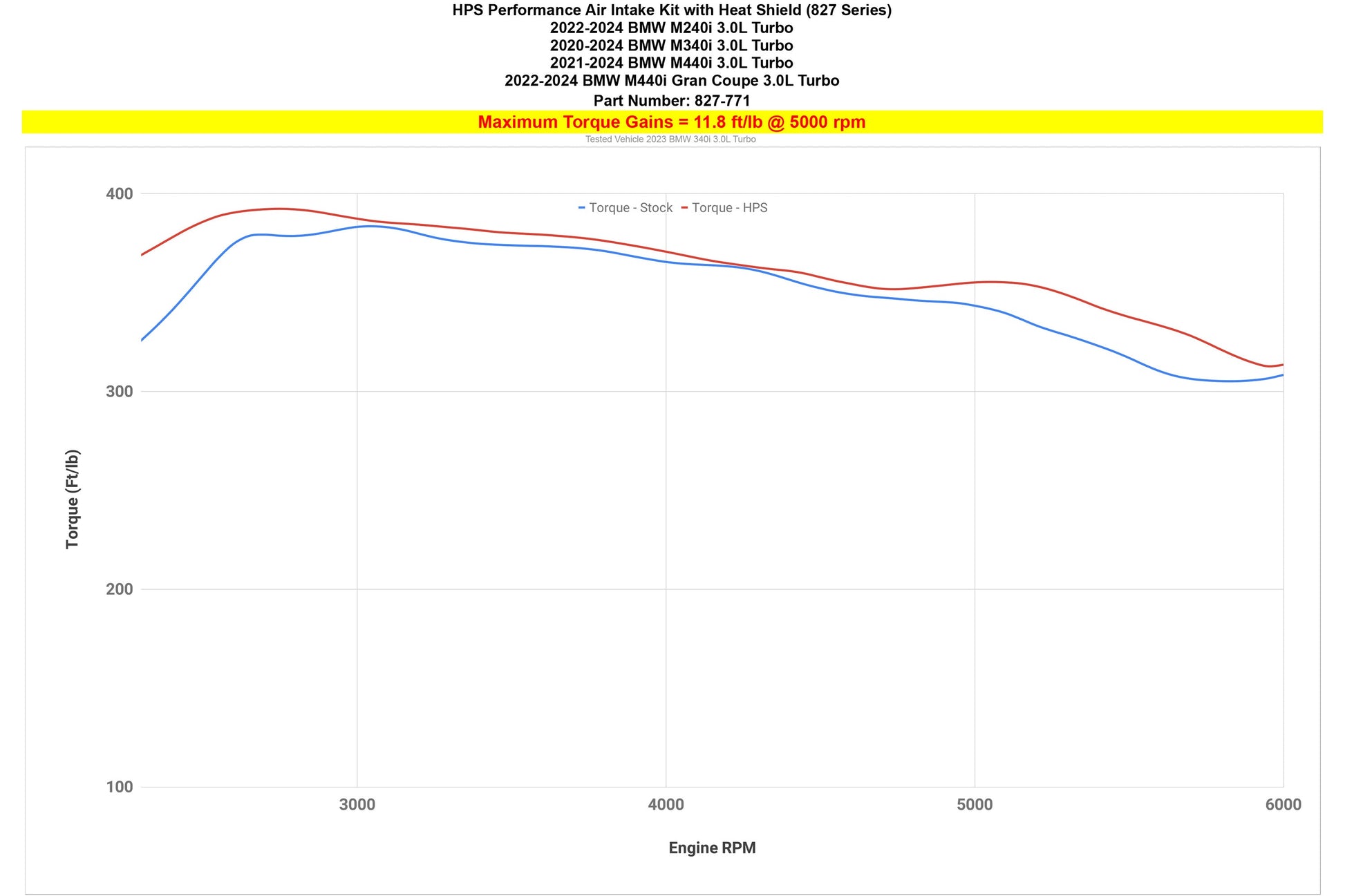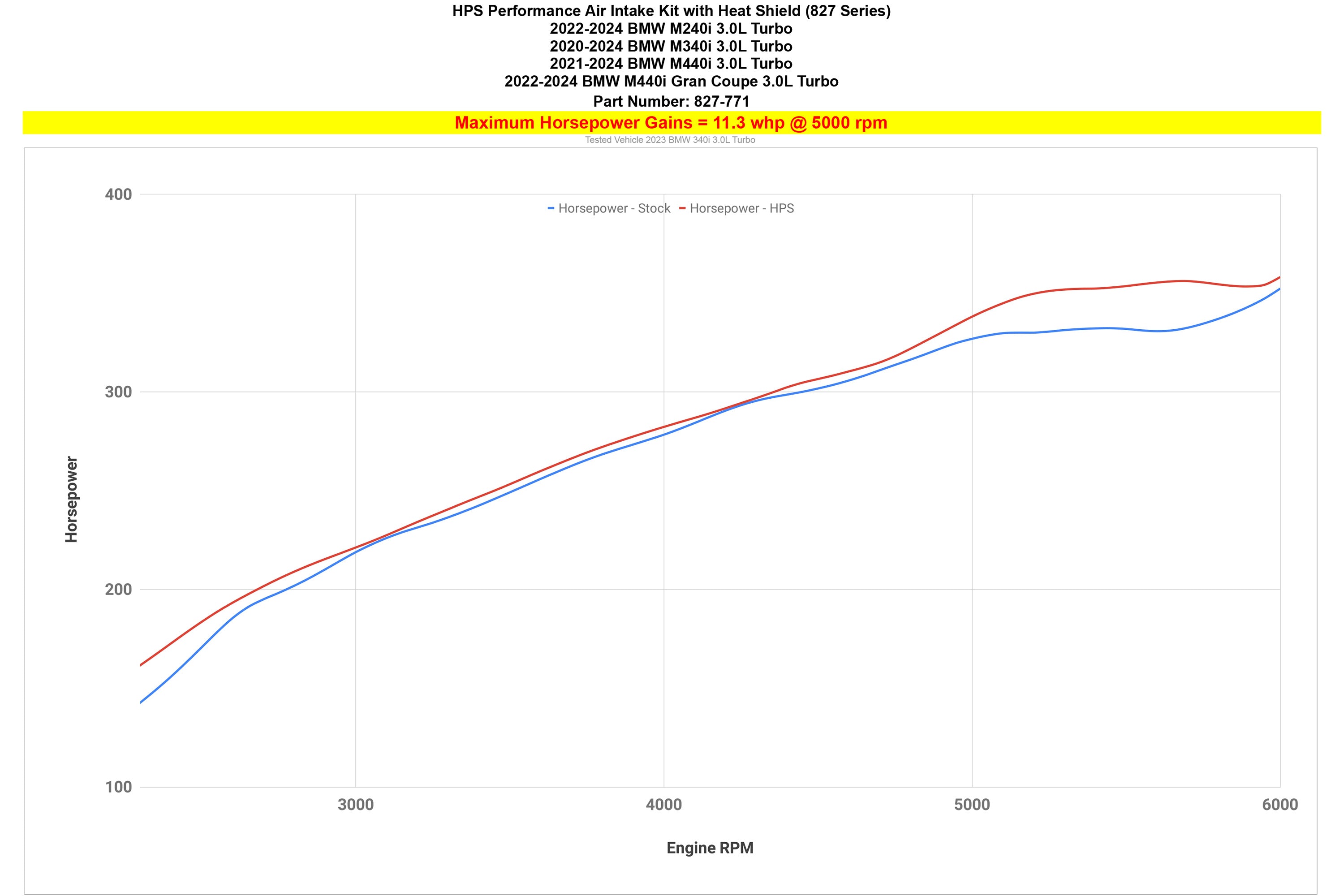 Take your BMW to the next level with this HPS Performance Air Intake Kit. Engineered as a direct upgraded replacement for your restrictive stock intake and airbox, this kit is a simple way to optimize your engine’s power without needing to add a tune or consider additional modifications. Crafted from premium 3.5" mandrel-bent aluminum tubing, the intake tube ensures smoother airflow, while the high-temperature resistant couplers and robust stainless steel embossed hose clamps guarantee durability and longevity. The featured billet aluminum quick connect adapter eliminates the stock plastic resonator, a known weak point within the induction system that can fail over time. The meticulously designed steel powder coated heat shield safeguards against engine bay heat to keep intake air temperatures at bay for maximum performance gains. Within the heat shield is a high-flow, washable and reusable air filter that draws in greater air volume while effectively trapping fine particles from entering your induction system. This easy-to-install kit delivers dyno-proven gains of up to 11.3 additional horsepower and 11.8 lb-ft. of additional torque. Experience explosive acceleration, enhanced throttle response, and a throatier engine sound as your vehicle takes the road with a refined sense of performance and luxury that HPS is known for.