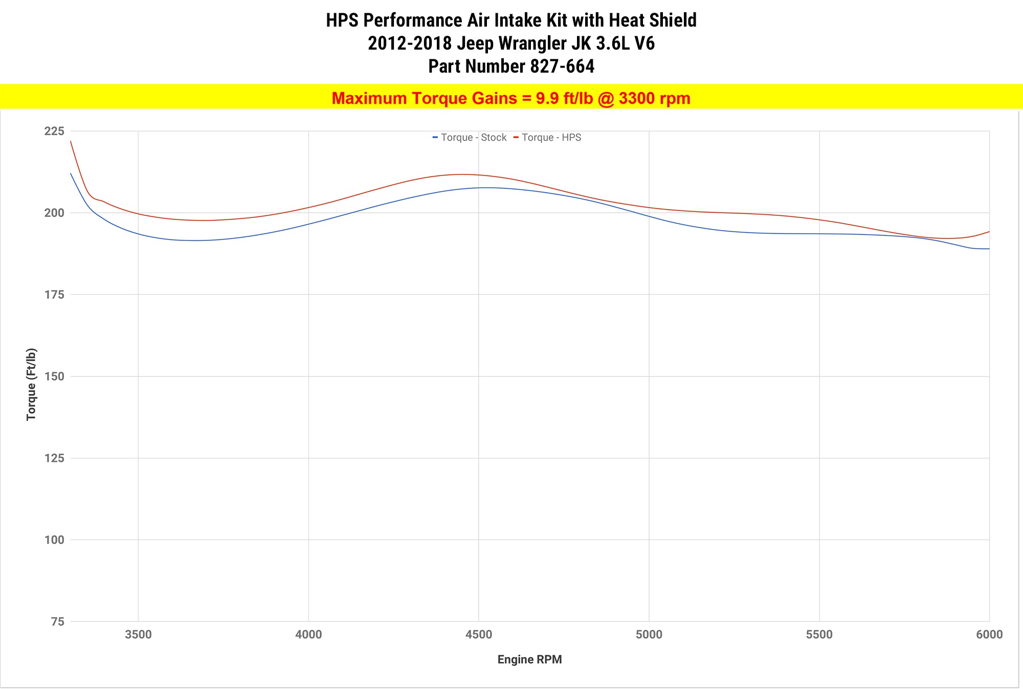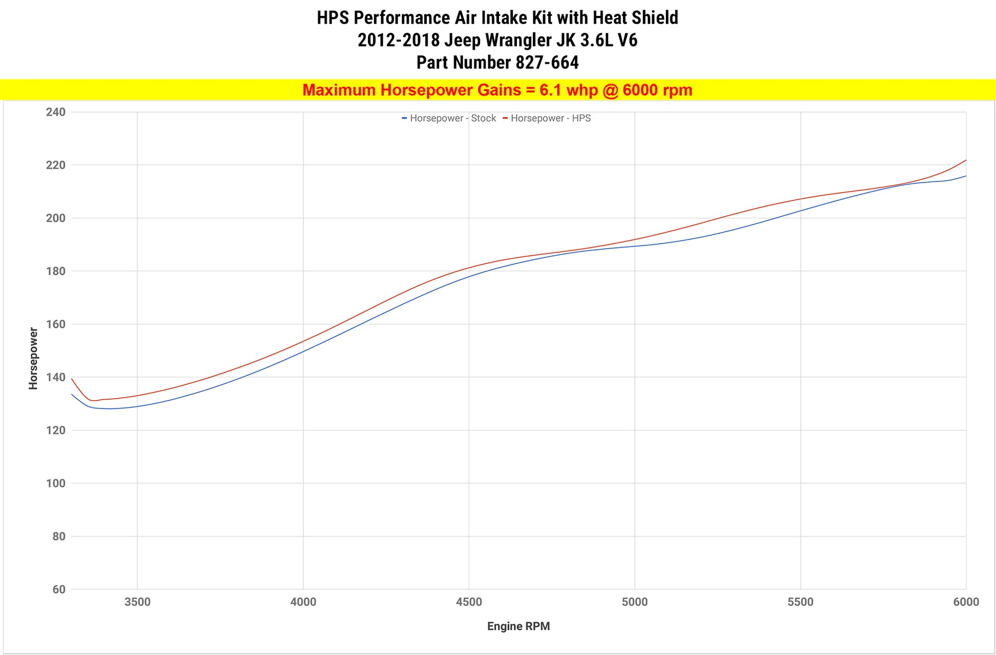HPS blue performance cold air intake with heat shield part number 827-664BL for 2012-2018 Jeep Wrangler JK 3.6L V6 offers a free-flowing 3.25" mandrel-bent aluminum tube induction system designed to improve throttle response and produce dyno proven performance gains +6.1 Whp horsepower, +9.9 Ft/lbs torque while maintaining safe air fuel ratio. The heavy duty powder coated steel heat shield included in the kit blocks out the heat from engine and maximize the cooling effect. The included installation manual has clear pictures and instructions to guide the installer throughout the whole process. The kit does NOT require tuning and does not trigger CEL light. No modification is required during the installation. HPS light weight 3.25" mandrel-bent aluminum alloy piping replace the stock restrictive air box and optimize the air flow with long lasting durability. HPS performance cold air intake kit features HPS signature race proven reinforced silicone hoses and industrial grade 100% stainless steel T-bolt clamps which ensures reliability, even during the most extreme driving conditions. The All-New HPS Performance Air Filters are made in the United State and are designed with performance in mind, delivering excellent filtration without sacrificing air flow. Washable and reusable. NOT CARB Complaint. Vehicle Application: 2012-2018 Jeep Wrangler JK 3.6L V6