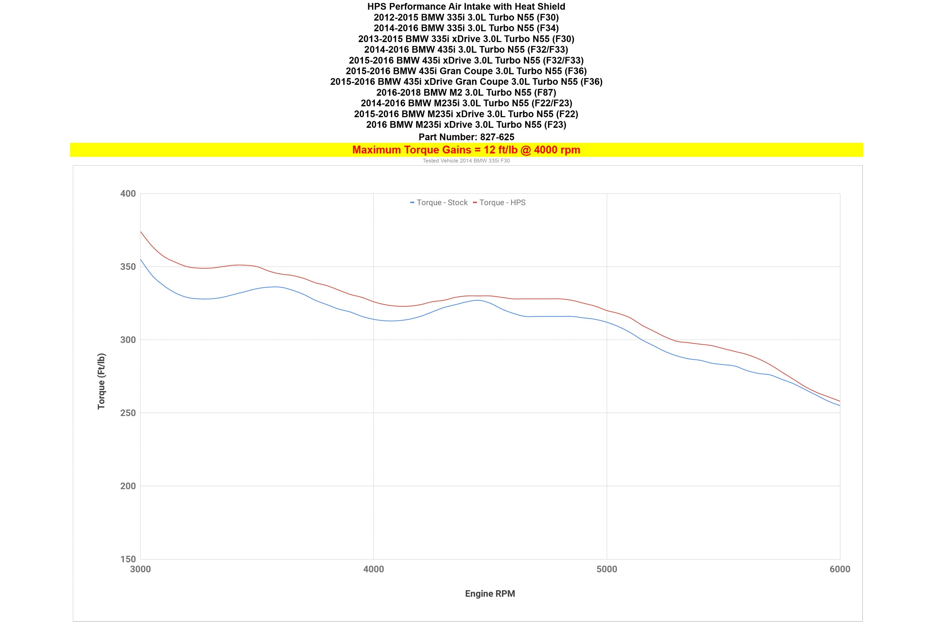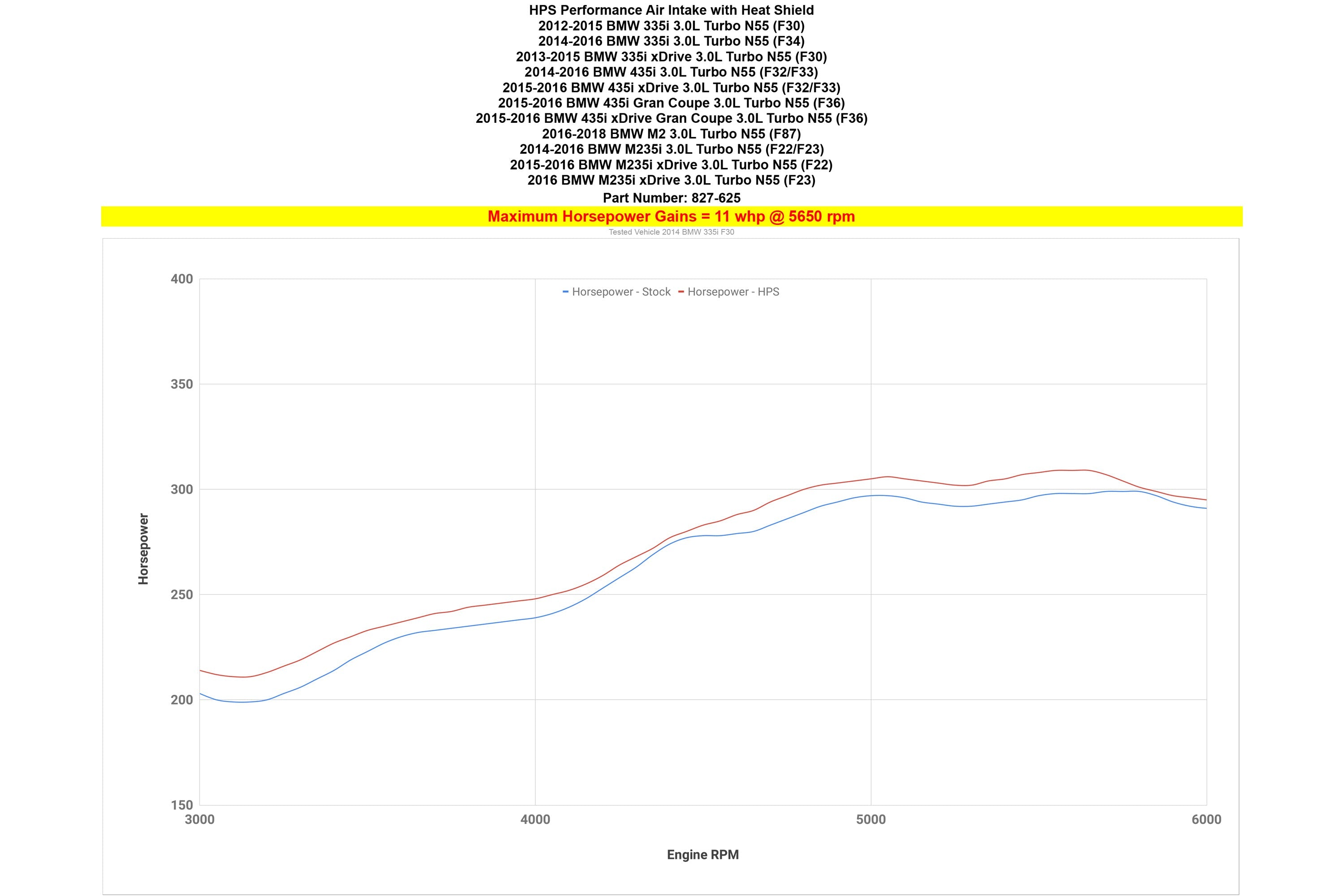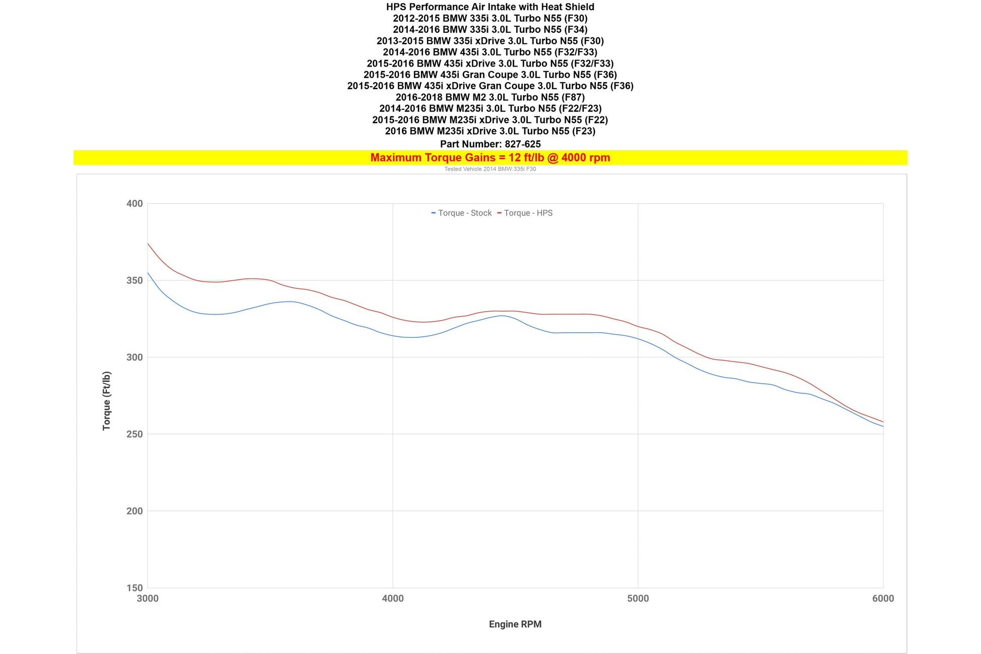 Take your N55 BMW to the next level with the HPS Performance Air Intake Kit. This high-performance upgrade features a 3.25" mandrel-bent aluminum tube designed to optimize airflow and maximize engine performance. Dyno-proven results deliver an additional boost of 11 horsepower and 12 ft-lb torque, while also enhancing throttle response and overall drivability. A robust powder-coated steel heat shield safeguards the air filter from radiant heat within the engine bay, ensuring greater cooling efficiency. Engineered to work seamlessly with your BMW, there is no need to tune or further modify your vehicle. Crafted from durable materials, this intake kit is built to endure even the most demanding driving conditions without compromising performance. The included high-flow air filter is fully washable and reusable, offering exceptional filtration while minimizing the need to completely replace your filter between services. Both easy to install and maintain, this premium replacement can change how you experience your sports car whether you're cruising on the street or racing on the track.