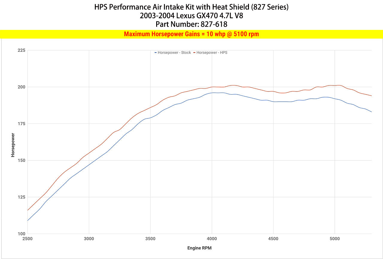 HPS red performance shortram air intake with heat shield part number 827-618R for 2003-2004 Lexus GX470 4.7L V8 offers a free-flowing 3.5" mandrel-bent aluminum tube cold air induction system designed to improve throttle response and produce dyno proven performance gains +6.5 Whp horsepower, +6.1 Ft/lbs torque while maintaining safe air fuel ratio. The heavy duty powder coated steel heat shield blocks out the heat from engine and maximize the cooling effect. The included installation manual has clear pictures and instructions to guide the installer throughout the whole process. The kit does NOT require tuning and does not trigger CEL light. No modification is required during the installation. HPS light weight 3.5" mandrel-bent aluminum alloy piping replace the stock restrictive air box and optimize the air flow with long lasting durability. HPS performance short ram air intake kit features HPS signature race proven reinforced silicone hoses and industrial grade 100% stainless steel T-bolt clamps which ensures reliability, even during the most extreme driving conditions. The All-New HPS Performance Air Filters are made in the United State and are designed with performance in mind, delivering excellent filtration without sacrificing air flow. Washable and reusable. NOT CARB Complaint. Vehicle Application: 2003-2004 Lexus GX470 4.7L V8