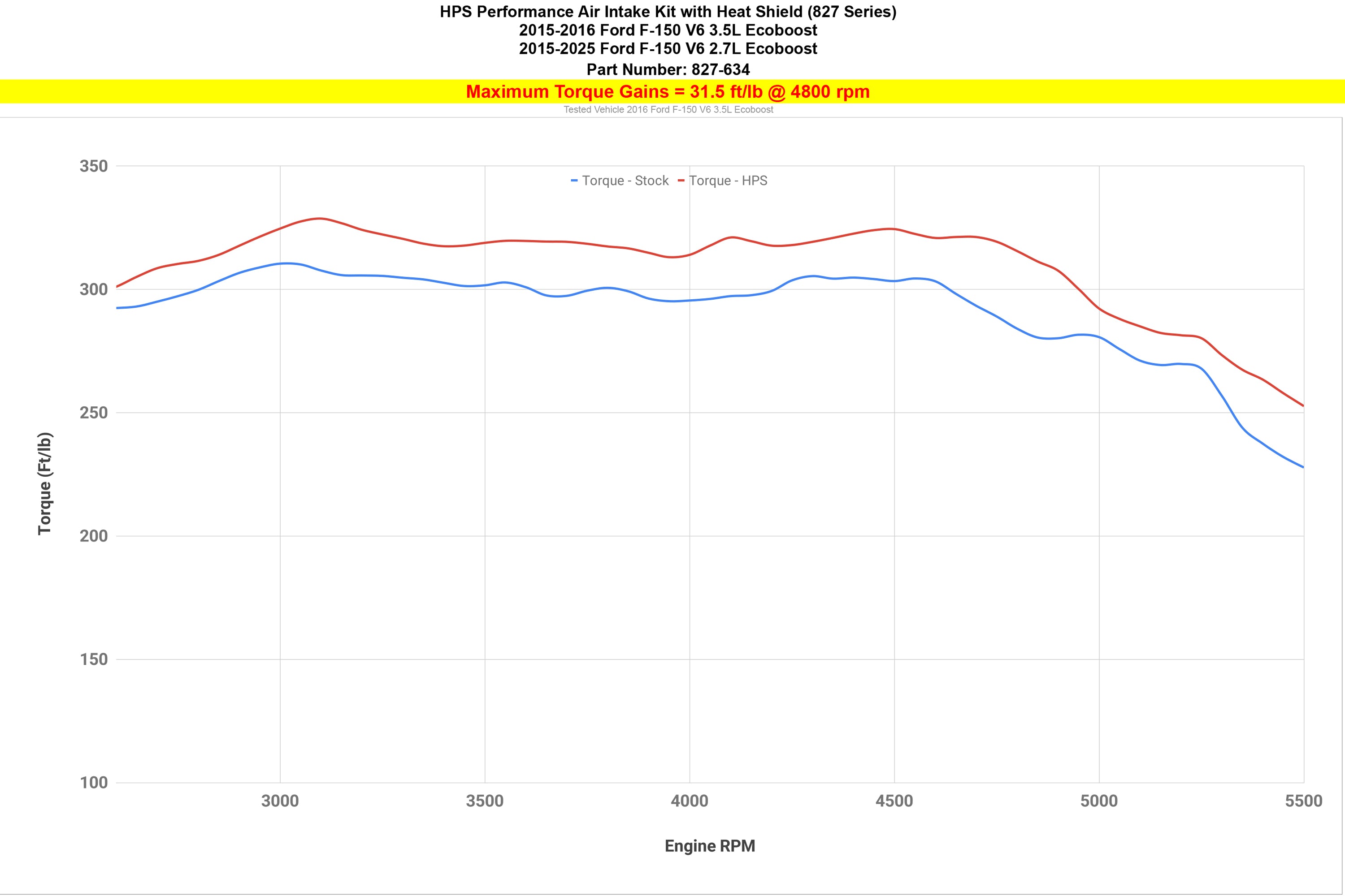 The HPS Performance Air Intake Kit is an easy-to-install upgrade that delivers a more powerful driving experience through improved throttle response and dyno-proven gains of up to 28.8 horsepower and 31.5 lb-ft of torque, all while maintaining a safe air-fuel ratio. To maximize cooling and performance, the kit includes a heavy-duty powder-coated steel heat shield that blocks engine heat. The restrictive stock air box and panel filter are replaced by a 3.5” mandrel-bent aluminum intake pipe and high-flow air filter, optimizing airflow with long-lasting durability. The washable and reusable high-flow air filter is specifically designed for performance, delivering excellent filtration of particles as small as 5 microns without sacrificing airflow. Even in the most extreme driving conditions, reliability is ensured by high-temperature resistant, 3-ply reinforced silicone hoses and 100% stainless steel T-bolt clamps.