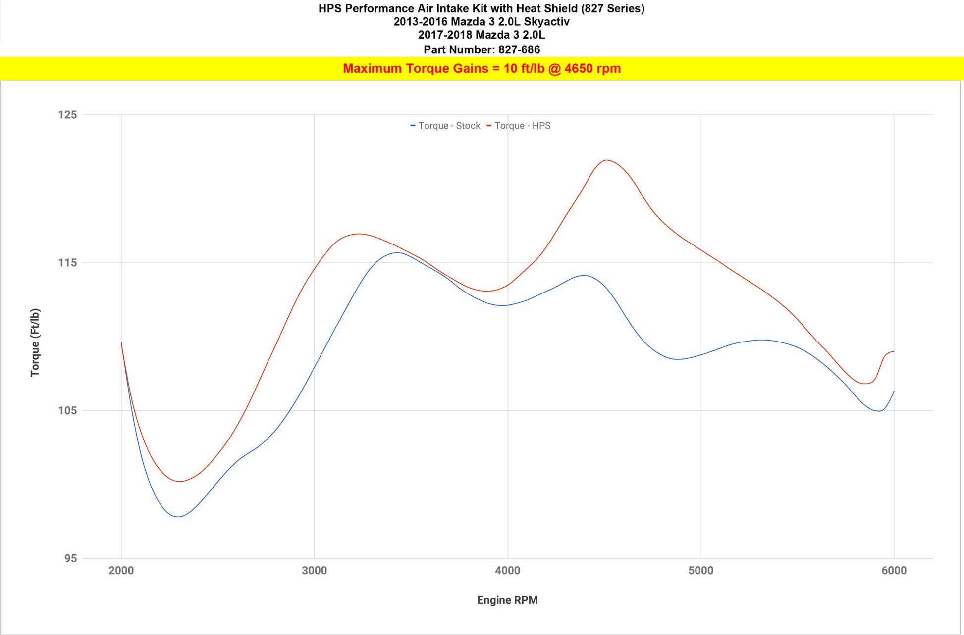 The All-New HPS Performance 827 Series Air Intake Kit (Red, Part # 827-686R) for 2013-2018 Mazda Mazda3 2.0L Skyactiv offers a free-flowing 3 inch mandrel-bent aluminum tube induction system designed to produce dyno proven performance gains +10 Whp horsepower, +10 Ft/lbs torque and improve throttle response while maintaining safe air fuel ratio. The heavy duty powder coated steel heat shield integrates with the factory fresh air scoop to direct cold air to the air filters for the best cooling effect. The included installation manual has clear pictures and instructions to guide the installer throughout the whole process. The kit does NOT require tuning and does not trigger CEL light. No modification is required during the installation. HPS light weight mandrel-bent aluminum alloy tubes replace the stock restrictive air box and optimize the air flow with long lasting durability. HPS Performance 827 Series air intake kit features race proven reinforced silicone hoses and industrial grade 100% stainless steel T-bolt clamps which ensures reliability, even during the most extreme driving conditions. The All-New HPS Performance Air Filter is designed with performance in mind, delivering excellent filtration without sacrificing air flow. All HPS Performance Air Filters are made in the United States.