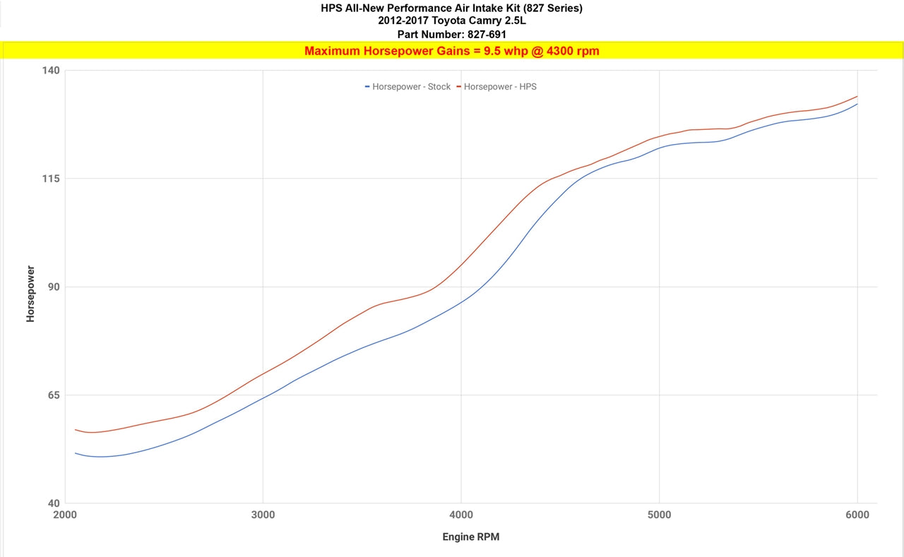 HPS Performance Air Intake Kits are designed with style and performance in mind. This HPS Performance Air Intake Kit replaces the factory intake and air filter housing with a 3" custom mandrel-bent aluminum tube and heavy duty powder coated heat shield designed to maximize the performance of this vehicle. The heat shield integrates with the factory air scoop and features a lid to keep intake air temperatures cool. It also includes a reusable high-flow cotton air filter to provide maximum airflow to increase the engine's output by up to 9.5 horsepower and 6.1 lb-ft. of torque for power that's felt through improved throttle response and acceleration. This kit features both HPS 100% stainless steel T-bolt clamps and a silicone coupler that are engineered to withstand the toughest driving conditions. HPS Performance Air Intake Kits are designed and tested using the latest technology to ensure the best performance and fitment.