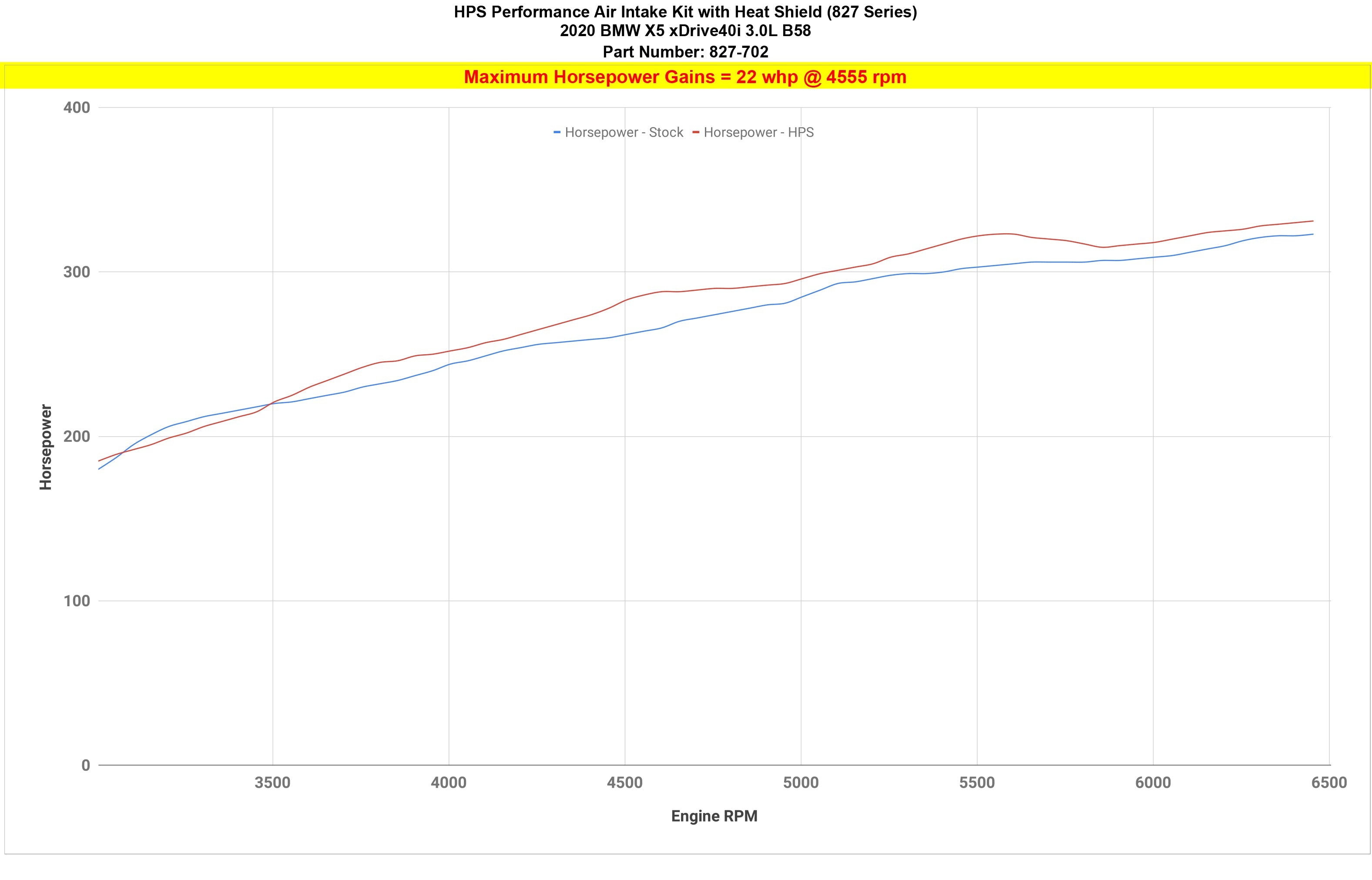 HPS Performance Air Intake Kits are designed with style and performance in mind. This HPS Performance Air Intake Kit replaces the factory intake and air filter housing with a 3.5" custom mandrel-bent aluminum tube and powder coated heavy duty heat shield designed to maximize the performance of the BMW B58 turbocharged straight-six engine. Included is a reusable high-flow cotton air filter to provide maximum airflow to increase your engine's output by up to 22 horsepower and 26 lb-ft. of torque for power you can feel through improved throttle response and acceleration. This kit includes HPS 100% stainless steel T-bolt clamps and 3-ply reinforced silicone couplers that are engineered to withstand the toughest driving conditions. HPS Performance Air Intake Kits are designed and tested using the latest technology to ensure the best performance and fitment.