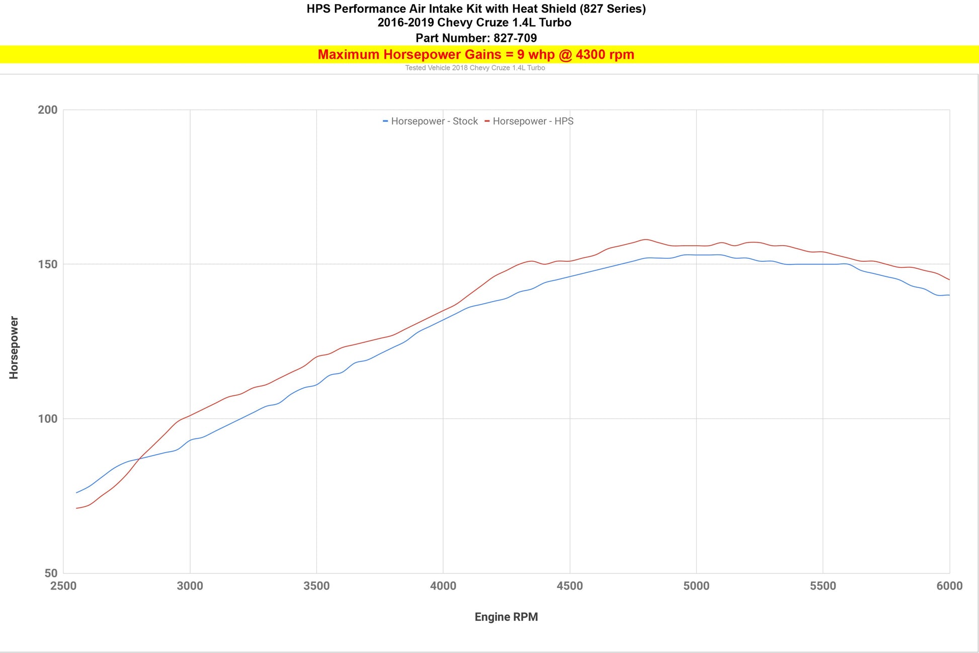 Discover the hidden power in your vehicle with the HPS Performance Air Intake Kit. This upgrade ditches the restrictive stock intake and air box for a free-breathing system designed to boost performance. The intake features mandrel-bent aluminum tubing that ensures smooth, uninterrupted airflow to your engine. A high-flow, reusable cotton air filter replaces the stock filter, allowing your engine to breathe deeply for maximum power. A specially designed heat shield keeps incoming air cool while unleashing the iconic turbocharged sound. With dyno-proven gains of 9 horsepower and 11 lb-ft of torque, this intake kit by HPS gives you a noticeable edge in acceleration and throttle response, especially in your everyday driving range. Developed from a history of race-proven durability, this performance upgrade is built to last. High-temperature resistant, 3-ply reinforced silicone couplers and 100% stainless steel T-bolt clamps ensure a secure and reliable connection even in the harshest operating conditions. HPS Performance Air Intake Kits install quickly and easily using simple hand tools, so you can enjoy the performance upgrade without a complicated process. REMARK: Not compatible with 2016 Cruze Limited 1.4L Turbo