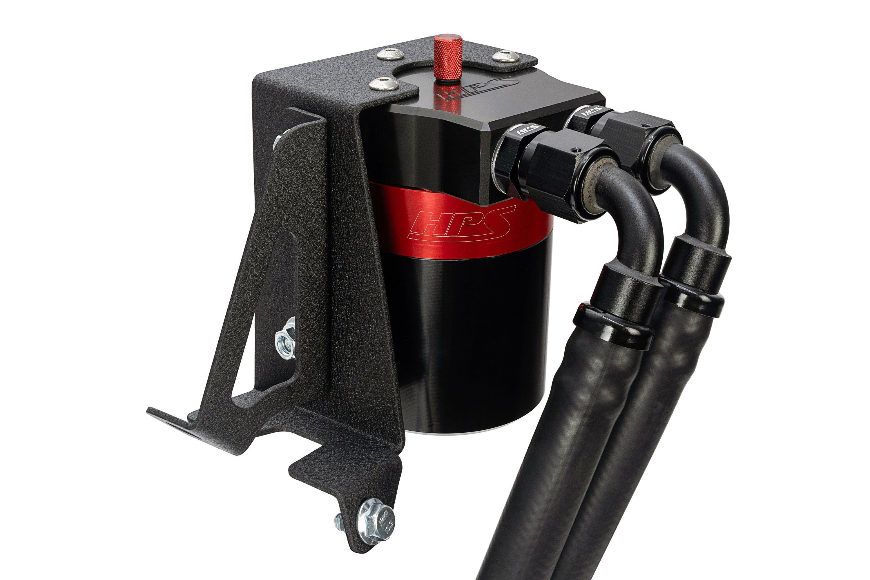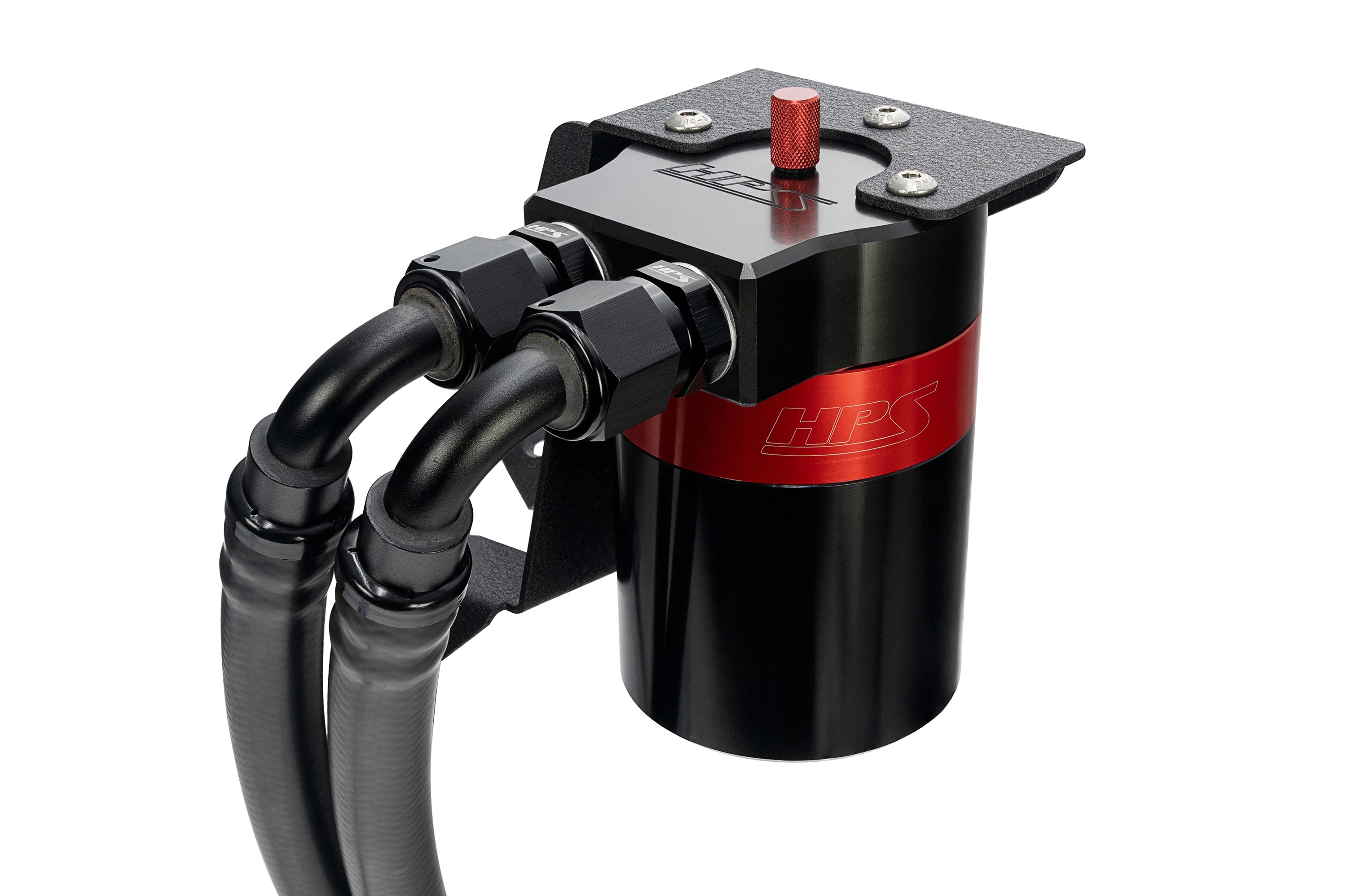 The HPS Performance Oil Catch Can is a must-have accessory for any vehicle owner seeking to maximize engine performance and longevity. By capturing harmful crankcase blow-by, a mixture of oil and vapor, before it can re-enter the combustion chamber, this catch can helps prevent the buildup of harmful carbon deposits on your intake valves. This not only improves engine efficiency but also extends the life of your engine's components. Designed with both performance and convenience in mind, the HPS Performance Oil Catch Can features a durable aluminum construction and a large 5-ounce capacity to reduce the frequency of maintenance. The included dipstick allows for easy monitoring of fluid levels, while the removable can with a 14mm hex at the bottom makes emptying the oil contents a simple task. Installation is a breeze thanks to the custom-designed powder-coated bracket that securely mounts the catch can to your vehicle without requiring any modifications. The kit also includes premium -8 AN reinforced rubber hoses and push-on fittings, providing everything you need for a quick and easy setup. By investing in the HPS Performance Oil Catch Can, you're not only protecting your engine from harmful contaminants but also enhancing its overall performance and efficiency. Experience the benefits of a cleaner intake system, improved fuel economy, and a longer-lasting engine with this essential upgrade.
