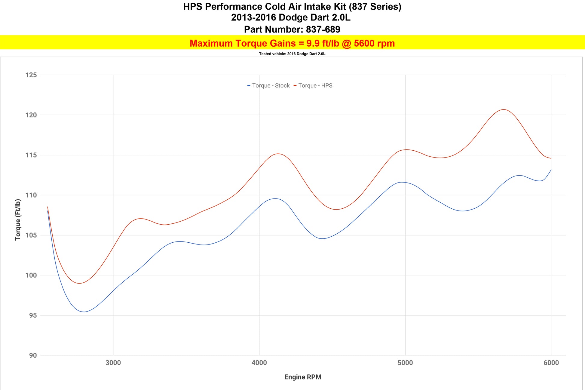 The All-New HPS Performance 837 Series Cold Air Intake Kit (Blue, Part # 837-689BL) for 2013-2016 Dodge Dart 2.0L Non Turbo offers a free-flowing 3 inch mandrel-bent aluminum tube induction system by relocating HPS Performance Air Filter outside of the engine compartment to deliver the coolest air inlet temperature. Compare to the tradiational intake setup, HPS Performance 837 Series cold air intake kit delivers cooler air with more oxygen, which translates into a more intense explosion in the vehicle combustion chamber to produce dyno proven performance gains - increase horsepower +9.6 whp , torque +9.2 ft/lbs and improve throttle response while maintaining safe air fuel ratio. The included installation manual has clear pictures and instructions to guide the installer throughout the whole process. The kit does NOT require tuning and does not trigger CEL light. No modification is required during the installation. HPS light weight mandrel-bent aluminum alloy tube replaces the stock restrictive air box and optimize the air flow with excellent heat dissipation and long lasting durability. HPS Performance 837 Series cold air intake kit features race proven reinforced silicone hoses and industrial grade 100% stainless steel T-bolt clamps which ensures reliability, even during the most extreme driving conditions. The All-New HPS Performance Air Filter is designed with performance in mind, delivering excellent filtration without sacrificing air flow. All HPS Performance Air Filter are made in the United States.
