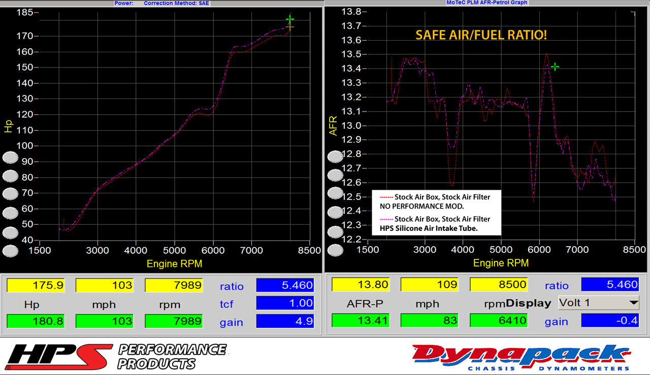 Without any re-tuning, the HPS silicone post MAF air intake tube delivers dyno-proven performance gains +4.9 Whp, +2.5 Ft/lbs