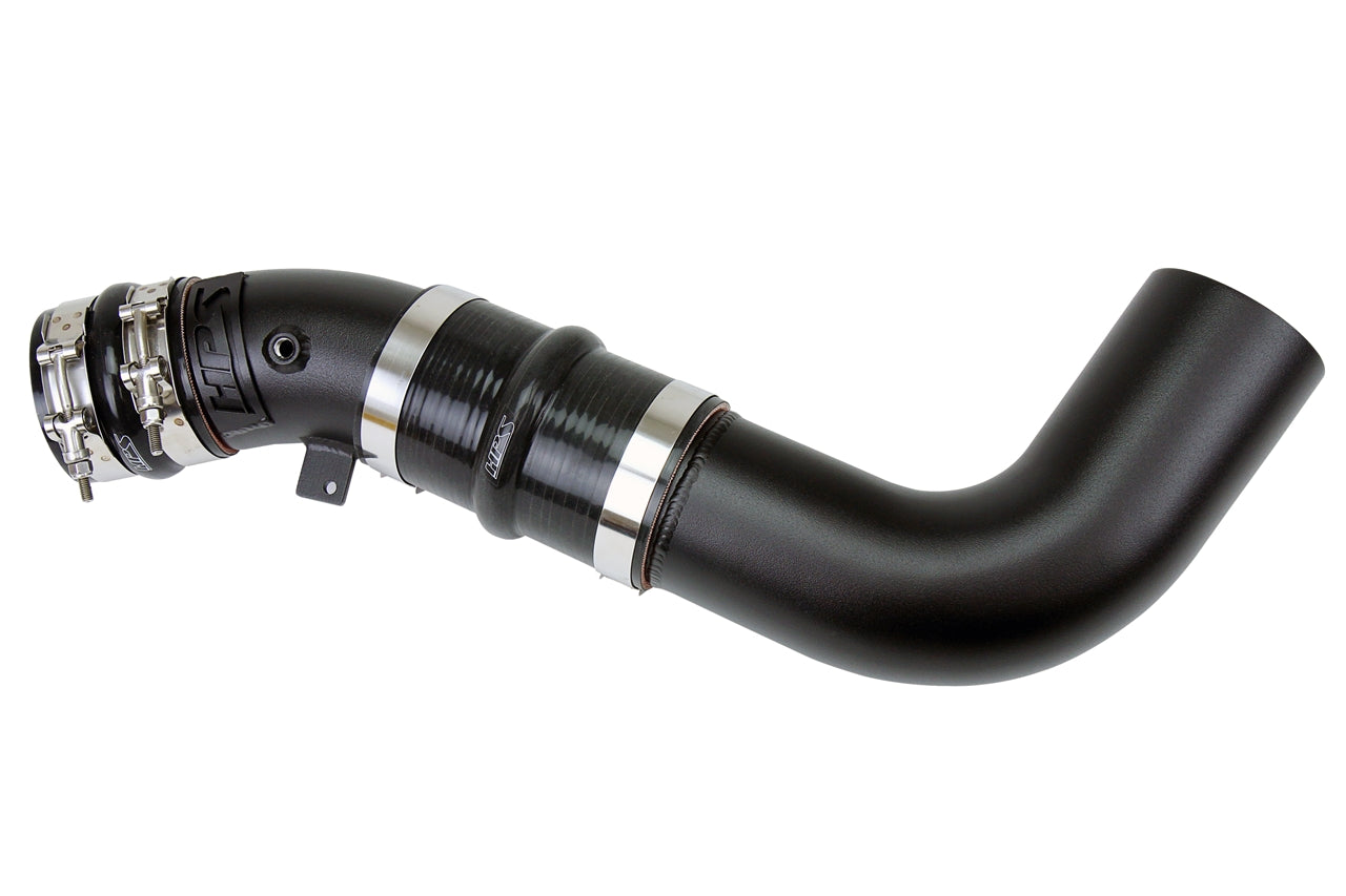 HPS black intercooler charge pipe cold side (Part# 17-120WB) is a simple yet effective performance upgrade for 2017-2020 GMC Sierra 3500HD Duramax 6.6L V8 Diesel Turbo L5P oem restrictive plastic intercooler piping. Enjoy quicker acceleration, improved fuel mileage, easier towing, and increased long-term reliability. Designed completely in Solidworks, this piece was made with ease of installation in mind. Utilizes the factory intercooler quick connect. Two-piece design allows for easier installation while offering flexibility from engine movement. Installation of a tuner is not required. Increase air volume and improve airflow. 3-1/2" Mandrel bent 6061 aluminum tubing with CNC machined billet flange and weld-on bung to connect?the existing auxiliary sensor. The kit also includes HPS signature high temperature 4-ply reinforced silicone coupler and heavy duty 100% stainless steel T-bolt clamps. Easy to follow step-by-step installation manual with clear pictures and instructions to guide the installer throughout the whole process. NOT CARB Complaint. Compatible with?factory intercooler. The product fits 2017-2020 GMC Sierra 3500HD Duramax 6.6L V8 Diesel Turbo L5P.