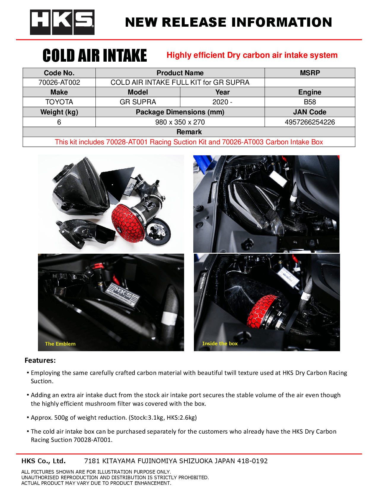 HKS 2020 Toyota Supra GR Cold Air Intake Full Kit