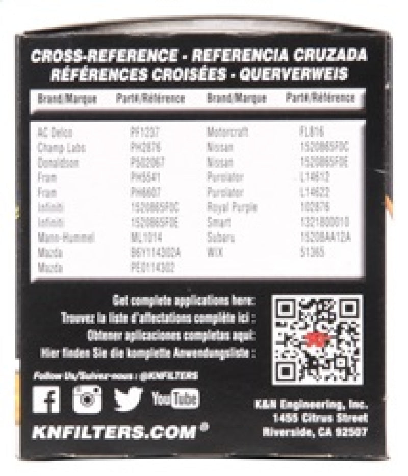 K&N premium oil filters are meticulously engineered to offer outstanding filtration and engine protection. Designed to operate with all synthetic, conventional, and blended motor oils, K&N's pleated synthetic-blend filtration media helps to shield your engine from contaminants and ensure a consistent flow of oil. The heavy-duty canister is engineered to be exceptionally durable, and a one-inch welded hex nut can be used for quick and easy filter removal. Each filter is specifically designed to withstand the service intervals recommended by vehicle manufacturers, and is protected by the K&N 1-Year Limited Warranty.