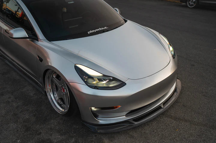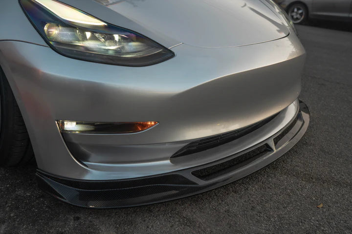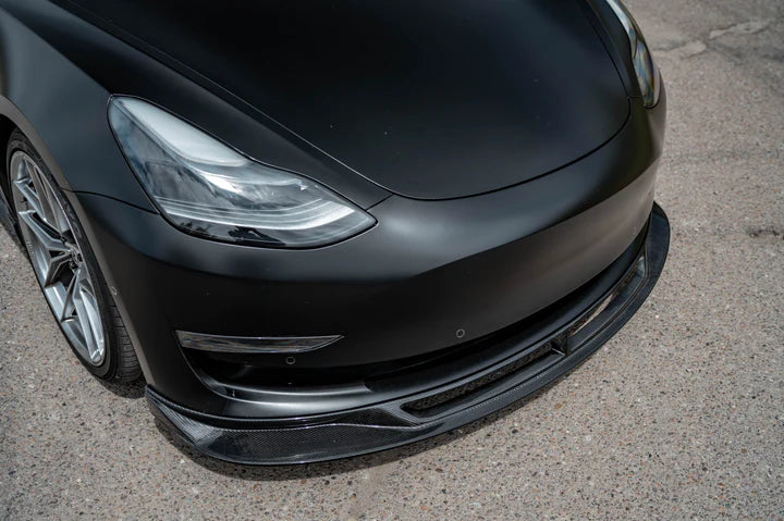StreetHunter Designs Tesla Model 3 Front Lip Incorporates our "V-notch" styling that flows with the emblem of the car Available in FRP and Carbon Fiber options FRP option does need to be painted or wrapped (satin black or body color suggested)