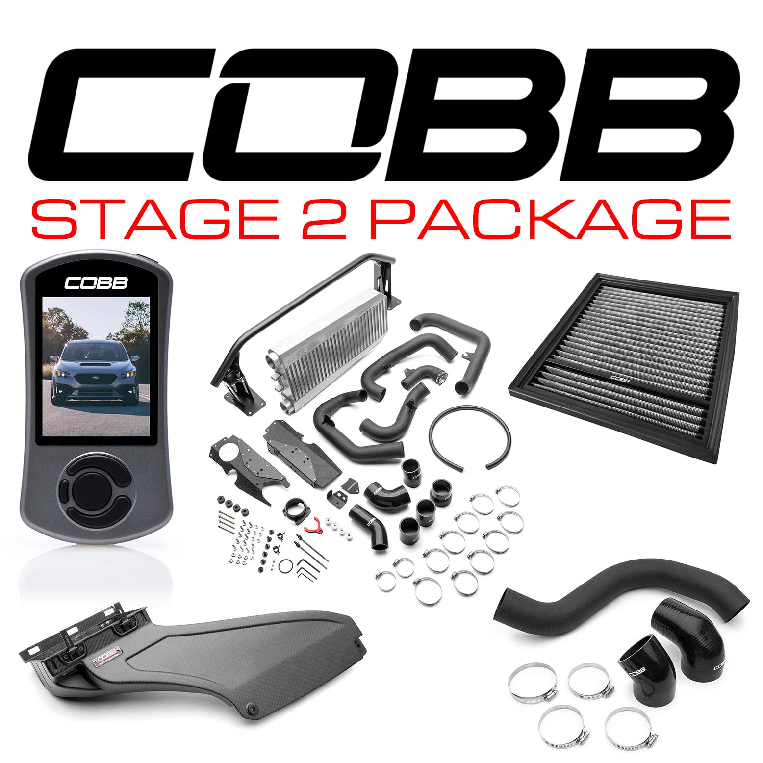 The Stage 2 Power Package Includes the Accessport, Silver Front Mount Intercooler kit, Matte Carbon Fiber Redline Power Scoop, High Flow Filter, Aluminum Intake Tube and a COBB Badge for the 2022-2025 Subaru WRX.