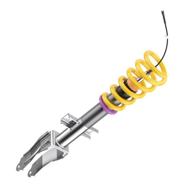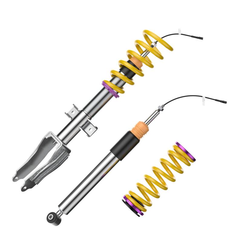 Today, more and more premium vehicles are being fitted with an electronically adaptive suspension system. Before KW DDC Plug & Play coilovers were introduced to the market, you often had to make compromises when customizing your suspension lowering, and often had to eliminate the active electronic control system and comfort features that you had paid extra for. With the adaptive KW DDC Plug & Play coilover suspensions there are no compromises to be made and you can combine the control of your standard damper system with a seamless suspension lowering and the driving dynamics tuned by KW suspensions experienced engineers. During installation, the factory electronic struts are simply replaced by KW INOX-LINE stainless steel coilover struts and the adaptive KW dampers are connected to the on-board electronics using your vehicles original plugs. Fitting a KW DDC Plug & Play coilover suspension requires no further modifications. The standard dampers can simply be replaced with the KW DDC (Dynamic Damping Control) coilover kit. The existing controls and the button installed in the vehicle interior for the operation of the damper control will now operate the KW DDC Plug & Play coilovers. For the first time, the KW DDC Plug & Play coilover kit combines the advantages of a KW coilover suspension with the convenience of the standard electronic damper controls. At the push of a button, the driver can choose between the Comfort, Normal and Sport setup optimized for the KW coilover suspension. In addition, the KW coilover suspension allows individual ride height adjustability within the tested Adjustment -angle. Our original equipment quality suspension technology -s compatible with various vehicle manufacturers. As a result, the adaptive KW DDC suspension is instantly recognized by the on-board electronics. So all the displays and controls of your factory vehicle remain fully functional but you get a completely new driving experience.