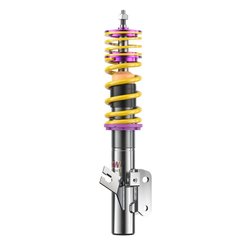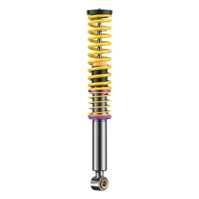 Cutting-edge motorsports technology for more performance on the road. Like every suspension product developed by KW automotive, the suspension manufacturer, and manufactured in Germany, the KW V3 Coilover suspension kit also provides a significant plus in safety reserves in road traffic. Thanks to the chassis with its high-quality dampers, springs, and elastomer spring elements, pitching and rolling movements during load changes such as evasive maneuvers, cornering, acceleration, and braking are significantly reduced. The braking distances are also shortened. Thanks to improved support and feedback, drivers not only feel safer but driving in everyday life becomes even safer. With compression and rebound stage damping, that can be set separately and independently of each other, the damper setup can be customized to your personal driving preferences or vehicle changes such as weight, tire characteristics, or altered vehicle rigidity. True performance optimization is only possible with this unique, patented system. For example, this allows the compression damping force to be increased and get more grip from the tires, to improve cornering behavior and reduce squat without simultaneously altering the rebound stage damping which is optimally matched to the spring rate, a scenario which results in reduced grip and the associated loss of performance. The KW V3 coilover kit is the ideal tool for performance-oriented drivers and experienced tuning enthusiasts who place a strong emphasis on the overall performance of their suspension. The Variant 3 features patented TVR-A and TVC-A technology that provides separately adjustable rebound and compression damping. The extensive adjustment range of the independently configurable rebound and compression make it easy to directly influence the steering behavior, directional stability, grip and handling characteristics for confident and repeatable results at the limit of driving dynamics.