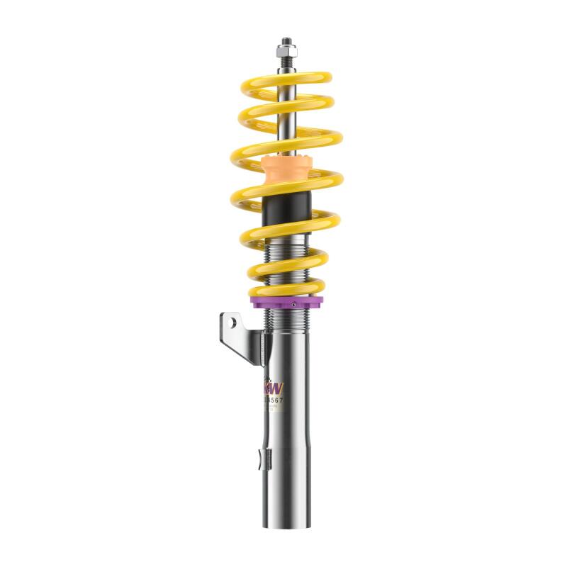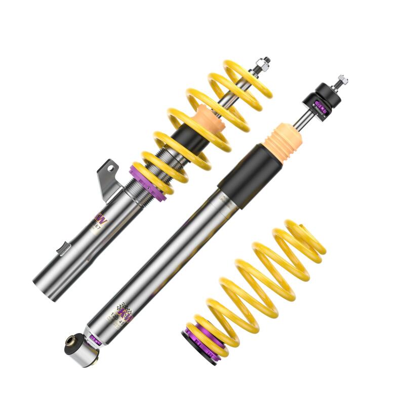 Cutting-edge motorsports technology for more performance on the road. Like every suspension product developed by KW automotive, the suspension manufacturer, and manufactured in Germany, the KW V3 Coilover suspension kit also provides a significant plus in safety reserves in road traffic. Thanks to the chassis with its high-quality dampers, springs, and elastomer spring elements, pitching and rolling movements during load changes such as evasive maneuvers, cornering, acceleration, and braking are significantly reduced. The braking distances are also shortened. Thanks to improved support and feedback, drivers not only feel safer but driving in everyday life becomes even safer. With compression and rebound stage damping, that can be set separately and independently of each other, the damper setup can be customized to your personal driving preferences or vehicle changes such as weight, tire characteristics, or altered vehicle rigidity. True performance optimization is only possible with this unique, patented system. For example, this allows the compression damping force to be increased and get more grip from the tires, to improve cornering behavior and reduce squat without simultaneously altering the rebound stage damping which is optimally matched to the spring rate, a scenario which results in reduced grip and the associated loss of performance. The KW V3 coilover kit is the ideal tool for performance-oriented drivers and experienced tuning enthusiasts who place a strong emphasis on the overall performance of their suspension. The Variant 3 features patented TVR-A and TVC-A technology that provides separately adjustable rebound and compression damping. The extensive adjustment range of the independently configurable rebound and compression make it easy to directly influence the steering behavior, directional stability, grip and handling characteristics for confident and repeatable results at the limit of driving dynamics.