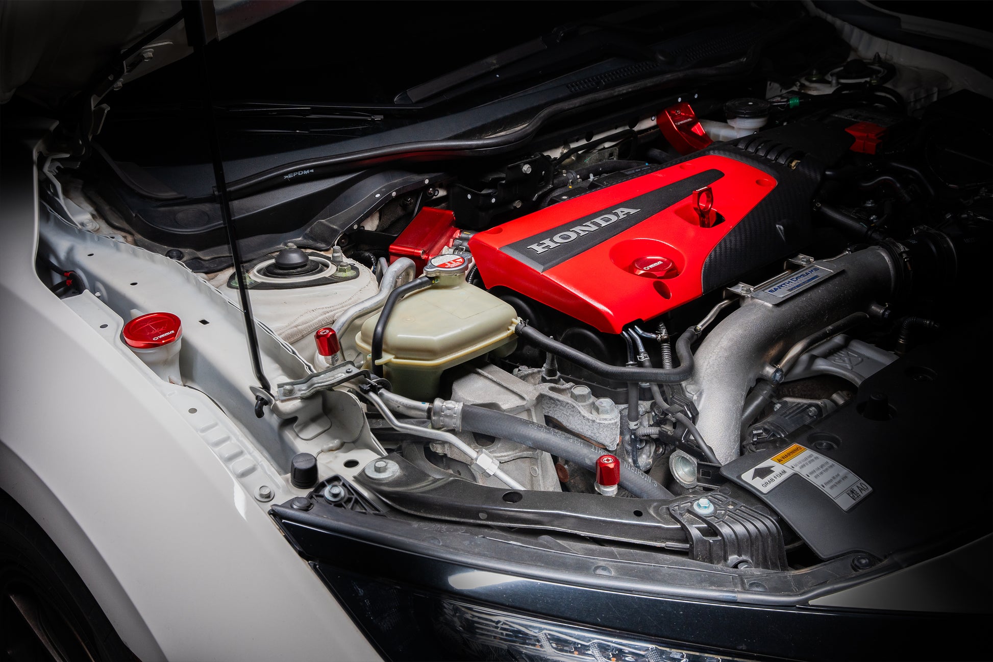 The caps were designed to snap on like factory pieces, but in bright dip anodized aluminum to add aesthetics to the engine bay as well. The units are entirely made in the USA. Machined in house on our 5-axis CNC mills, anodized locally, and laser engraved on our fiber laser in house.